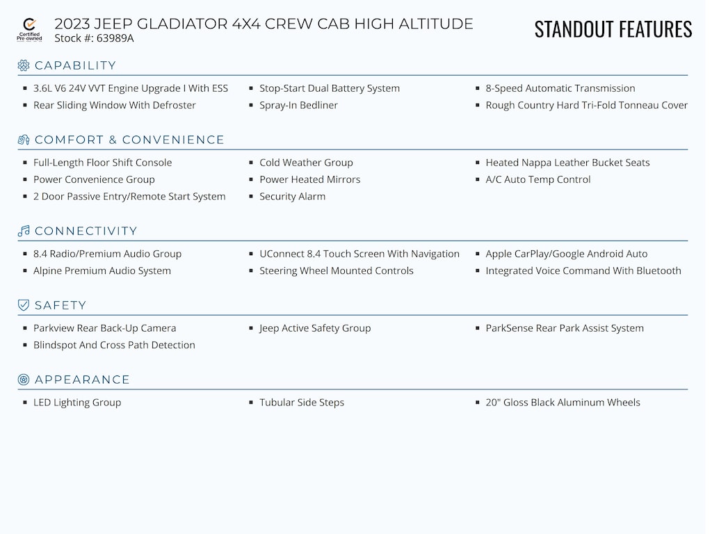 Standout features of this Certified Pre-Owned 2023 JEEP GLADIATOR 4X4 CREW CAB HIGH ALTITUDE include: