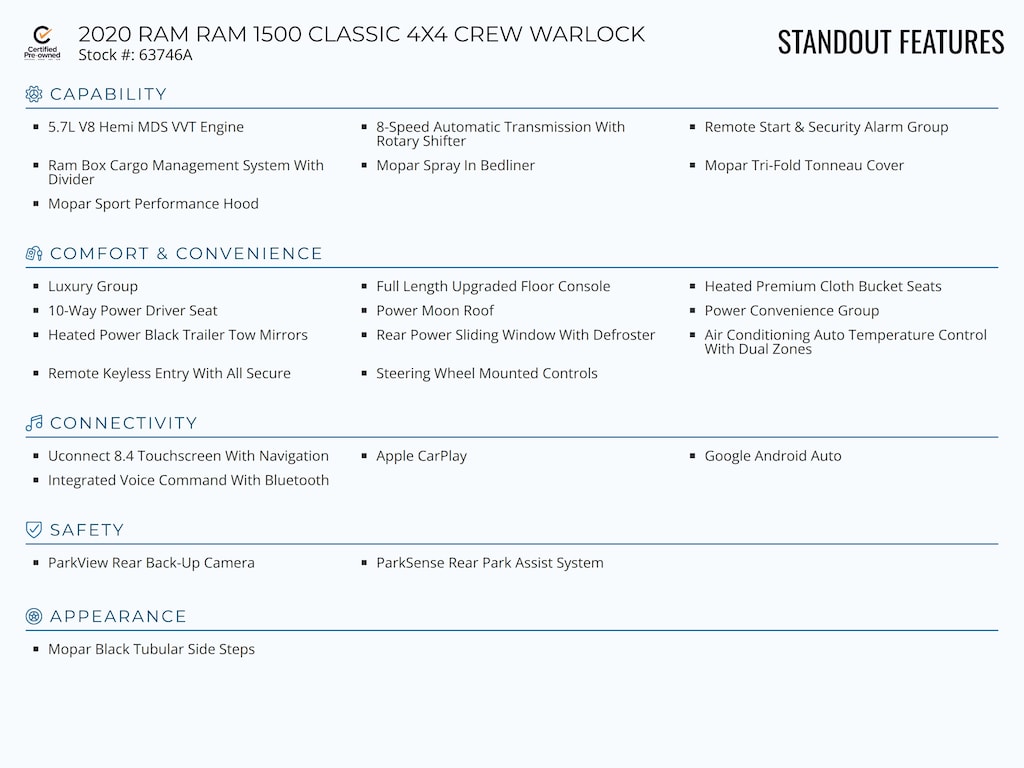 Standout features of this Certified Pre-Owned 2020 RAM RAM 1500 CLASSIC 4X4 CREW WARLOCK include: