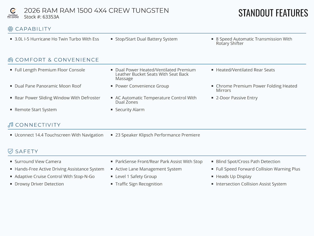 Standout features of this Certified Pre-Owned 2026 RAM RAM 1500 4X4 CREW TUNGSTEN include: