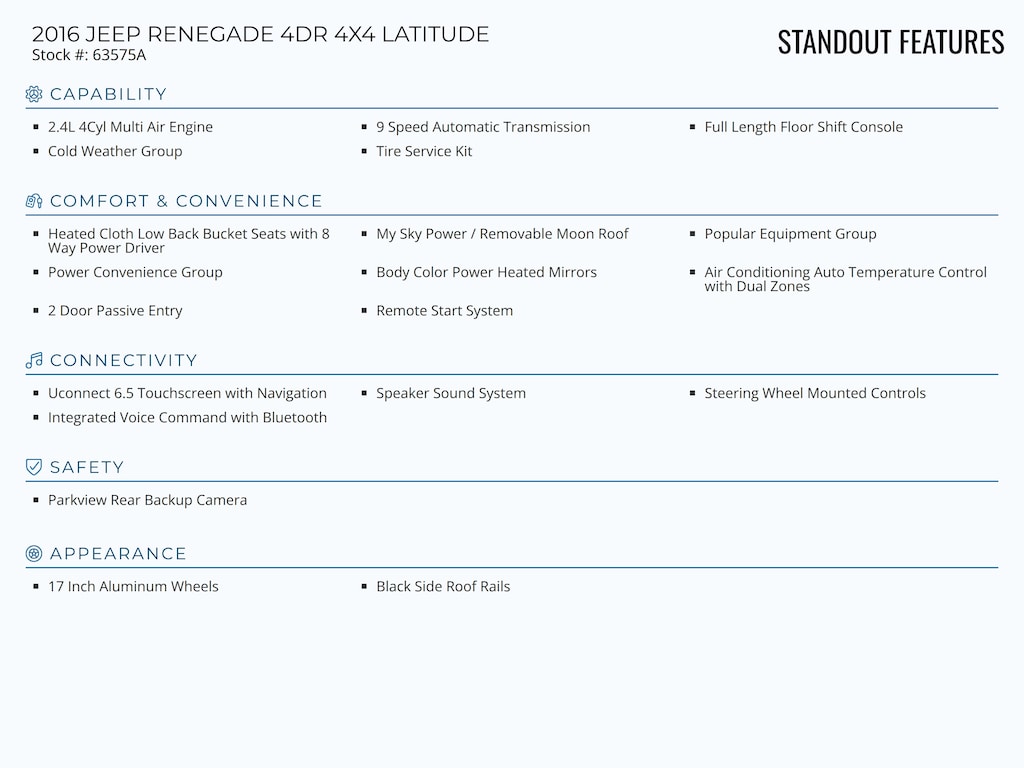 Standout features of this 2016 JEEP RENEGADE 4DR 4X4 LATITUDE include: