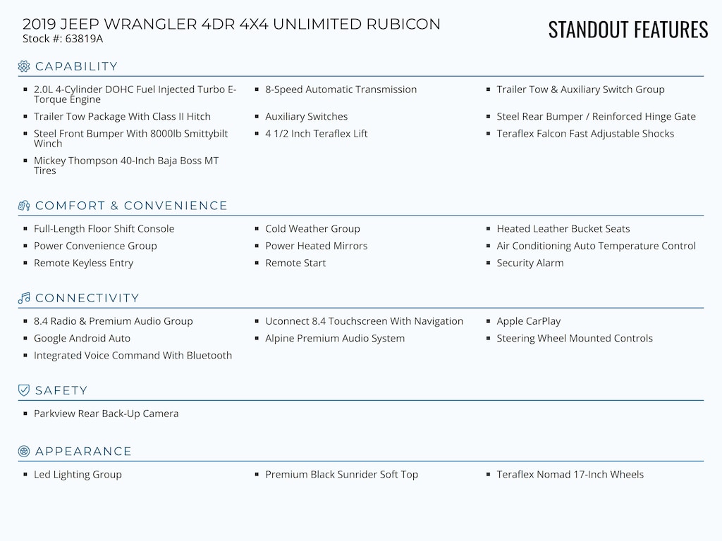 Capability: 2.0L 4-Cylinder DOHC Fuel Injected Turbo E-Torque Engine || 8-Speed Automatic Transmission || Trailer Tow & Auxiliary Switch Group || Trailer Tow Package With Class II Hitch || Auxiliary Switches || Steel Rear Bumper / Reinforced Hinge Gate || Steel Front Bumper With 8000lb Smittybilt Winch || 4 1/2 Inch Teraflex Lift || Teraflex Falcon Fast Adjustable Shocks || Mickey Thompson 40-Inch Baja Boss MT Tires