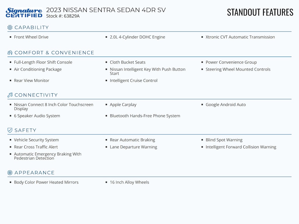 Standout features of this Signature Certified 2023 NISSAN SENTRA SEDAN 4DR SV include: