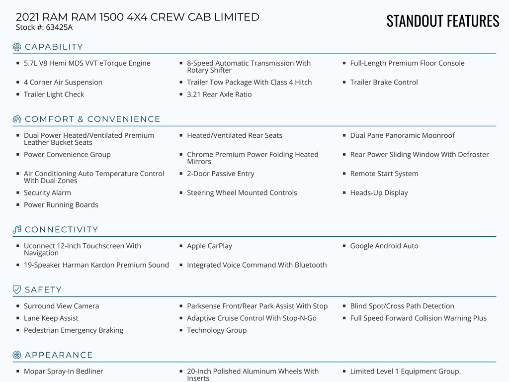 Standout features of this 2021 RAM RAM 1500 4X4 CREW CAB LIMITED include:
