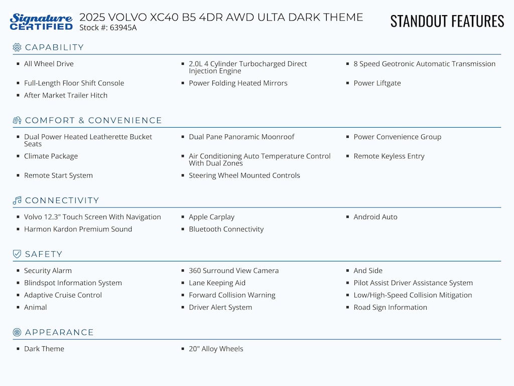 Standout features of this Signature Certified 2025 VOLVO XC40 B5 4DR AWD ULTA DARK THEME include: